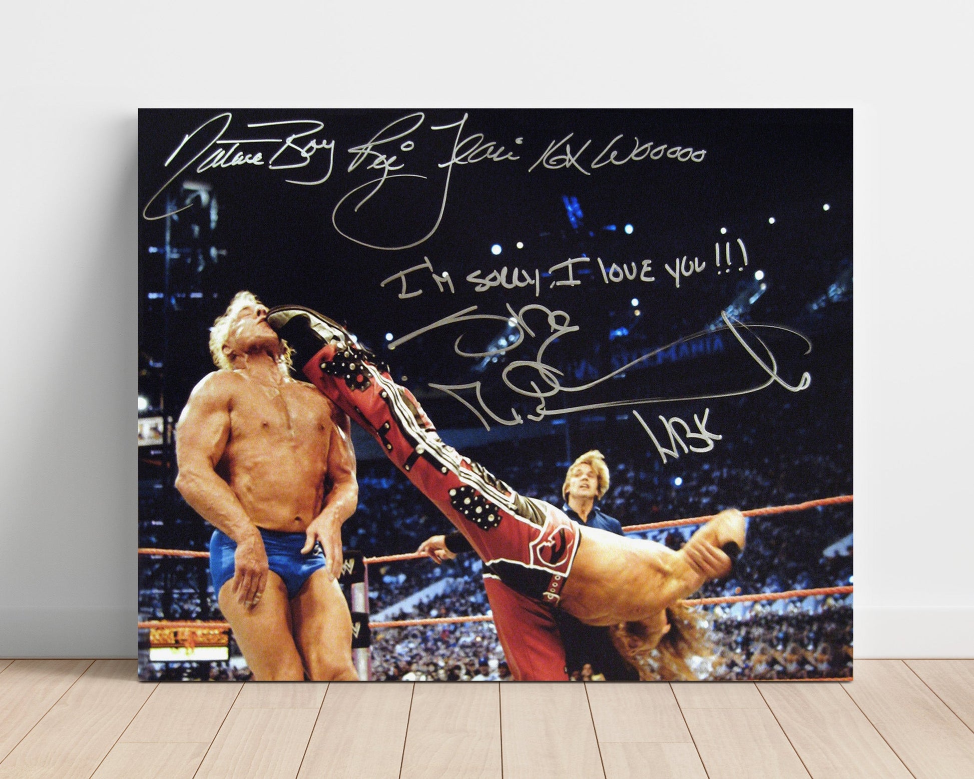 This photo captures Flair vs HBK in the unforgettable “Im Sorry I Love You” moment — a must-have for any wrestling fan.
